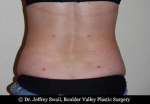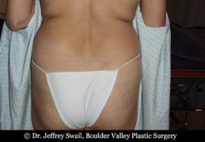 Reference #2082 | This photograph at several weeks after surgery shows tiny liposuction incisions that have not yet faded. They will become nearly invisible over 6-12 months after surgery. Early postoperative photographs do show immature scars but they eliminate diet and exercise as factors that can exagerate the effects of surgery. | Gender: Female