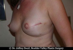 Reference #2033 | This patient had left mastectomy and immediate reconstruction with latissimus dorsi flap and breast implant. Nipple reconstruction was done immediately and tattooing for color at a later time. | Gender: Female