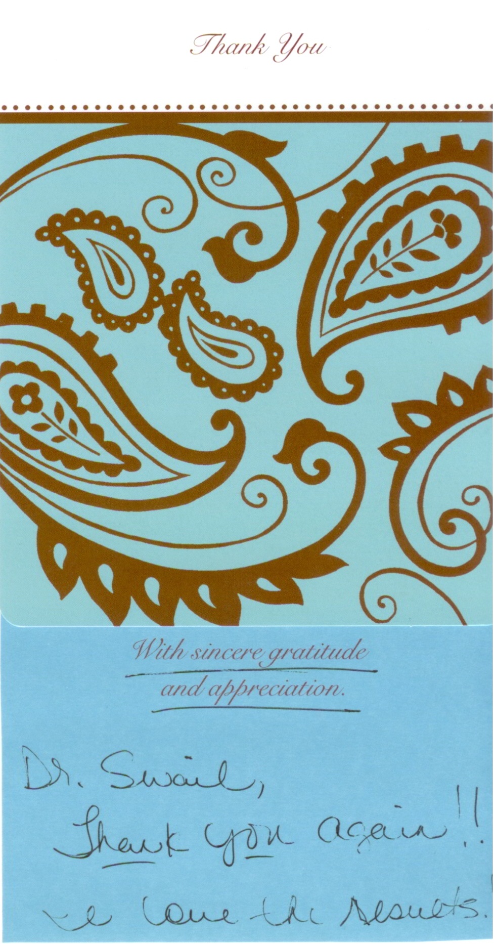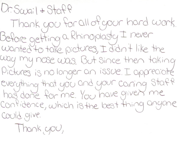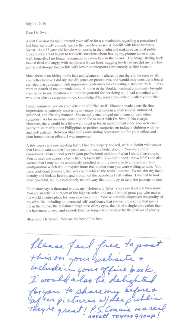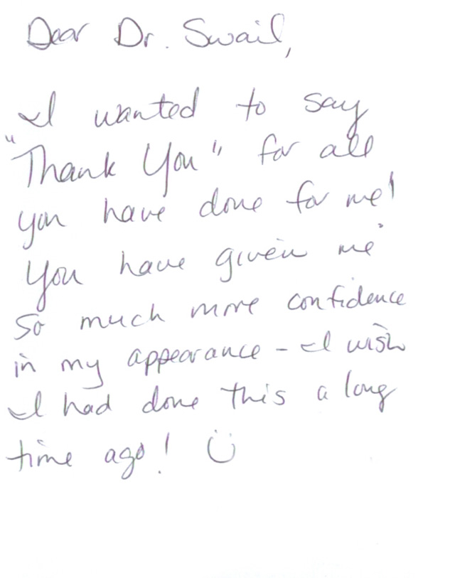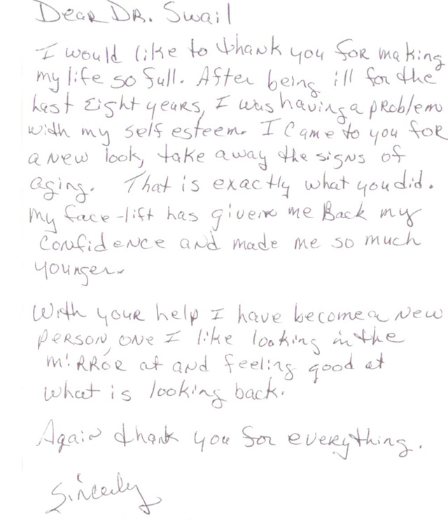 “Wonderful, friendly, knowledgeable staff. I am extremely happy with my removal of my “eye bags”. Thank you Dr. Swail and staff for making me feel good on the outside!”
