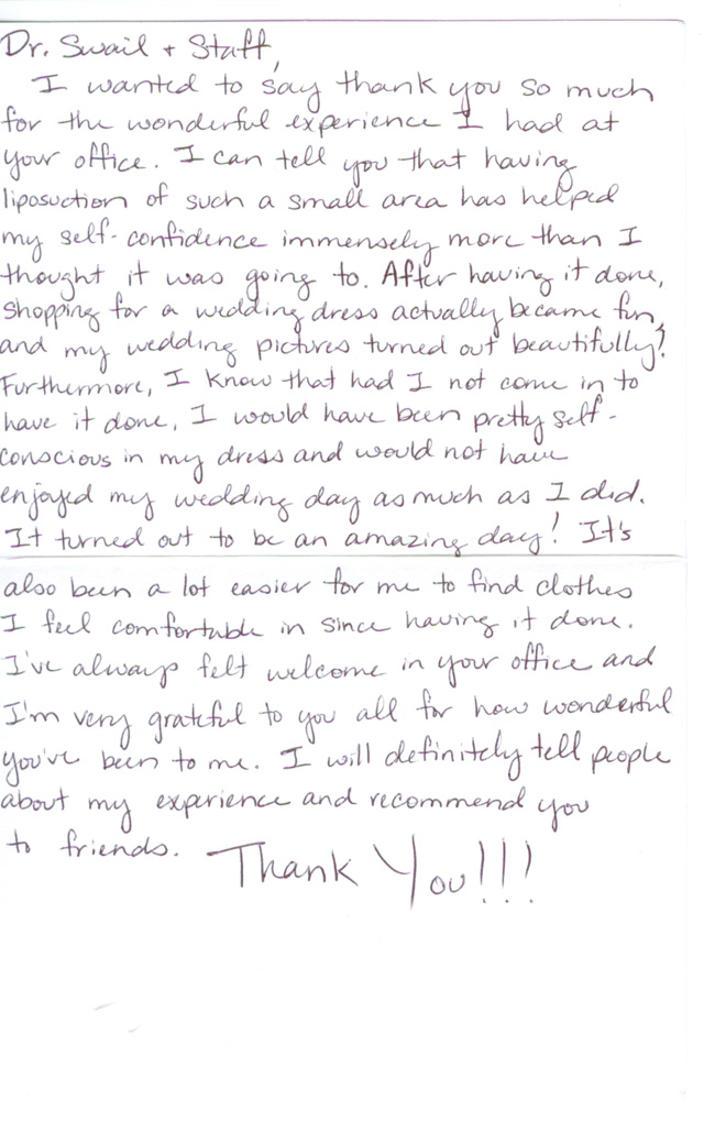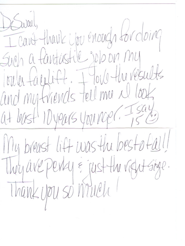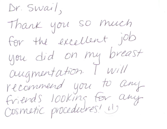 “This is my third set of breast implants, and the best by far. Dr Swail did an exceptional job of reducing the scars and shaping my new, smaller implants. I also had a tummy tuck in which, again, the scaring is minimal. The staff is not only attentive but they sincerely care and took the time to make me comfortable.”