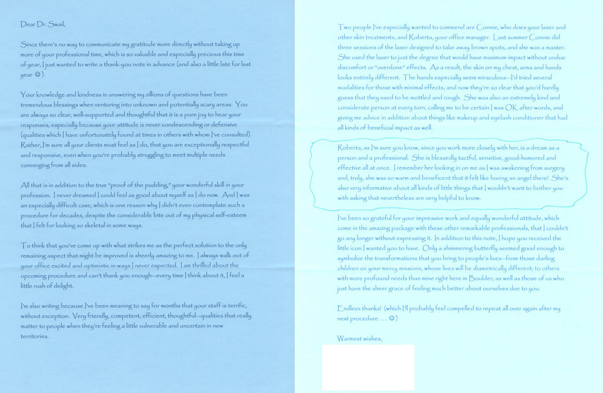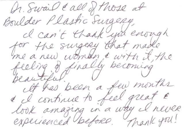 “Dr Swail and his staff are excellent at their craft. The staff is supportive and compassionate and Dr Swail takes the time to help his patients make the best decisions for them. No pressure or upselling. I felt fully informed about where scars would be and other changes I might experience post surgery. The results have exceeded my expectations and I would recommend Boulder Valley Plastic Surgery to any of my loved ones!”