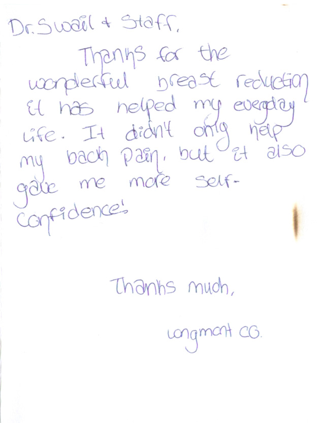 “Boulder Valley Plastic Surgery and Dr. Swail changed my life. I had a breast reduction almost 9 months ago, and the results dramatically improved the way I look and feel. The staff at BVPS are incredibly supportive, knowledgeable, and always kind when visiting their office. I spent several years researching different breast reduction procedures, and experienced surgeons. Ultimately, I chose BVPS and Dr. Swail, because of Dr. Swail’s level of expertise, in office surgery facilities, and most importantly Dr. Swell’s candor, and attention to detail. I’m a very happy patient! I highly recommend Dr. Swail to anyone considering a procedure to enhance their looks”