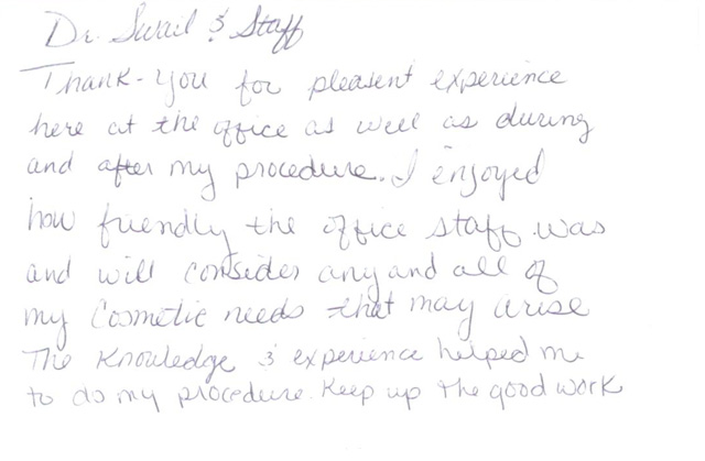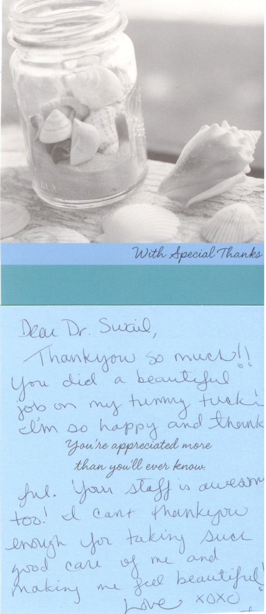 “So pleased with this experience!! Everything has gone beautifully and I’m extremely pleased with my tummy now its amazing!!! I loved that everything from beginning to end is done in their office and I got to go home the same day the procedure was done!! Very very talented, up to date , caring group of people that came together to change lives for the better everyday!! Thank you so so much Dr. S. and team, this is definitely one of my favorite experiences of my life!!! Thank you Thank you Thank you!! It was perfect”